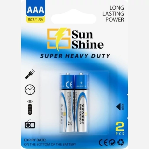 باتری‌های نیم قلمی (AAA) سان شاین، با ولتاژ ۱٫۵ ولت و تکنولوژی زینک-کربن، برای تأمین انرژی دستگاه‌های کم‌مصرف مانند ریموت‌کنترل‌ها، ساعت‌ها، چراغ‌قوه‌ها و اسباب‌بازی‌ها طراحی شده‌اند. این باتری‌ها در بسته‌های ۲ عددی کارتی عرضه می‌شوند و با توجه به تکنولوژی ساخت، برای استفاده در دستگاه‌های با مصرف پایین مناسب هستند.